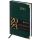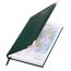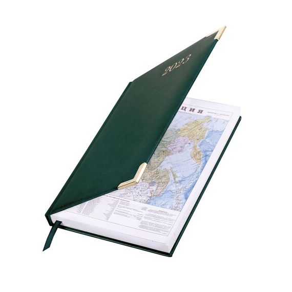 Внутренний блок включает 168 листов белой бумаги плотностью 70 г/м2. Каждая страничка имеет перфорированный угол. Благодаря стандартному формату А5 (138х213 мм) ежедневник удобно использовать как в офисе, так и на выездных деловых встречах. Твердая обложка стилизована под гладкую кожу благородного зеленого цвета. Подходит для горячего тиснения. Ежедневник имеет металлические уголки, что придает ему особый шарм. Форзац ежедневника представлен картами мира и России. Дополнением является закладка-ляссе, с помощью которой при необходимости можно быстро открыть ежедневник на нужной странице. Помимо прочего, ежедневник снабжен обширным справочным материалом.
