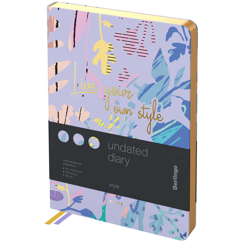 Недатированные ежедневники Berlingo "Style" в мягкой обложке из искусственной кожи с ярким дизайном. Фиолетовый цвет фона обложки. Фольгированные элементы дизайна на обложке. Золотой срез блока. Внутренний блок из 136 листов высококачественной кремовой бумаги повышенной плотности 80 г/м², пантонная печать в 2 краски, справочный материал и перфорированные уголки. Две закладки-ляссе. Отрывные заметки, бланки извещения о ДТП и справочные материалы. 3 комплекта стикеров станут приятным подарком. Индивидуальная упаковка. Подходят под персонализацию