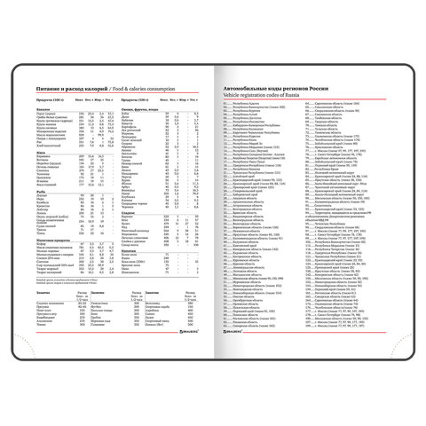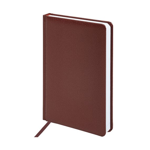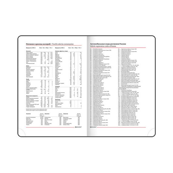 Внутренний блок включает 136 листов белой бумаги плотностью 70 г/м2. Каждая страничка имеет перфорированный угол. Благодаря стандартному формату А5 ежедневник удобно использовать как в офисе, так и на выездных деловых встречах. Твердая обложка, стилизованная под фактурную кожу, подходит только для тиснения фольгой. Дополнением является закладка-ляссе, с помощью которой при необходимости можно быстро открыть ежедневник на нужной странице. Помимо прочего ежедневник снабжен обширным справочным материалом.