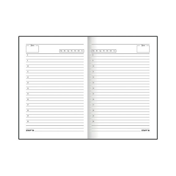 Недатированный ежедневник STAFF предназначен для ведения записей. Отсутствие дат делает его уникальным товаром, которым можно начать пользоваться в любое время года. Надежен и практичен в применении.