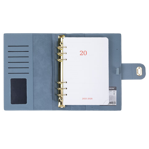 Твердая обложка с кольцевым механизмом оснащена дополнительными карманами для хранения бумаг, карточек и мелочей. Съемный внутренний блок включает 160 листов белой бумаги плотностью 70 г/м2. Благодаря формату B5 (167х240мм) ежедневник удобно использовать как в офисе, так и на выездных деловых встречах.