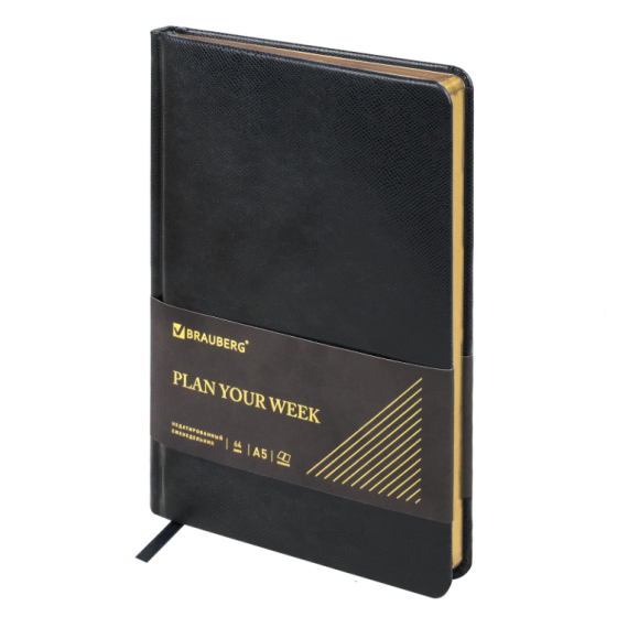 Внутренний блок включает 64 листа тонированной бумаги плотностью 70 г/м2. Благодаря стандартному формату А5 еженедельник удобно использовать как в офисе, так и на выездных деловых встречах. Твердая обложка, стилизованная под кожу рептилии, подходит для горячего тиснения. Срез еженедельника фольгирован золотой фольгой, что придает ему особый шарм. Дополнением является закладка-ляссе, с помощью которой при необходимости можно быстро открыть еженедельник на нужной странице. Помимо прочего, еженедельник снабжен обширным справочным материалом. Выполнен в классическом черном цвете.