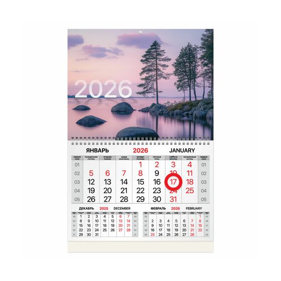 Офисный календарь на 2026 год на гребне. Состоит из 1 блока с календарными сетками на три месяца с магнитным курсором. Блок календаря напечатан на мелованной бумаге плотностью 80 г/м2. Подложка изготовлена из мелованного картона плотностью 250 г/м2. Магнитный курсор-бегунок выделяет текущую дату. Вертикальное расположение. Размер - 33,5х50,3 см.