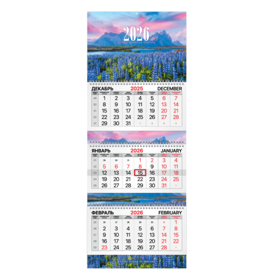 Офисный календарь на 2026 год на 3 гребнях. Для удобства планирования состоит из 3 блоков с календарными сетками на три месяца – предыдущий, текущий и следующий. Курсор-бегунок выделяет текущую дату.