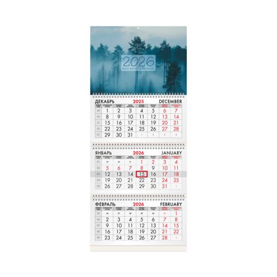 Офисный календарь на 2026 год на 3 гребнях. Состоит из 3 блоков с календарными сетками на три месяца – предыдущий, текущий и последующий. Блок календаря напечатан на офсетной бумаге плотностью 65 г/м2. Подложка изготовлена из мелованного картона плотностью 235 г/м2. Курсор-бегунок выделяет текущую дату. Вертикальный формат.