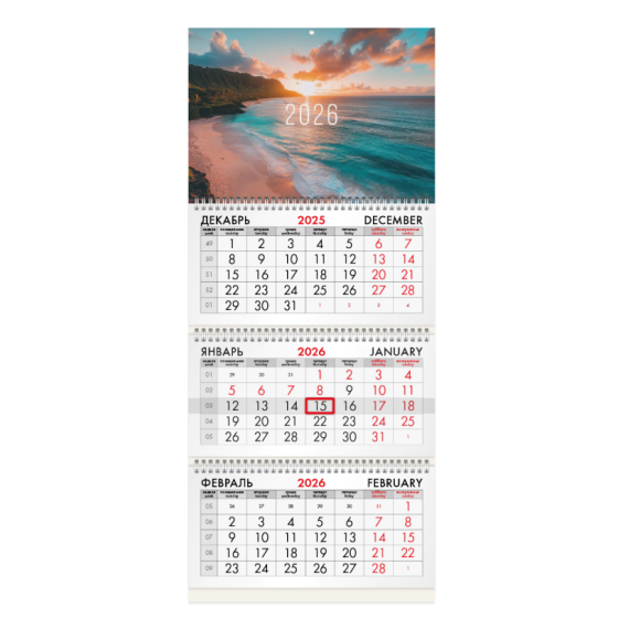 Офисный календарь на 2026 год на 3 гребнях. Состоит из 3 блоков с календарными сетками на три месяца – предыдущий, текущий и последующий. Блок календаря напечатан на офсетной бумаге плотностью 65 г/м2. Подложка изготовлена из мелованного картона плотностью 235 г/м2. Курсор-бегунок выделяет текущую дату. Вертикальный формат.