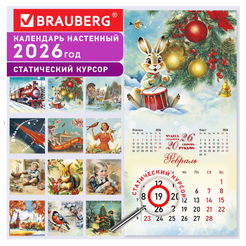 Календарь настенный перекидной 2026 г., BRAUBERG, 12 листов, 28,5х28,5 см, "Советские открытки"