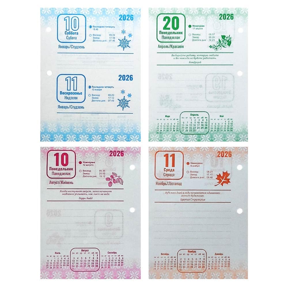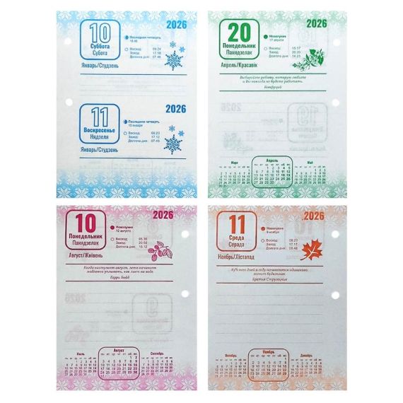 Календарь отпечатан на офсетной бумаге, что гарантирует чёткость печати и устойчивость к истиранию. Компактный размер 105 х 140 мм делает модель оптимальным решением для размещения на ограниченном пространстве стола.