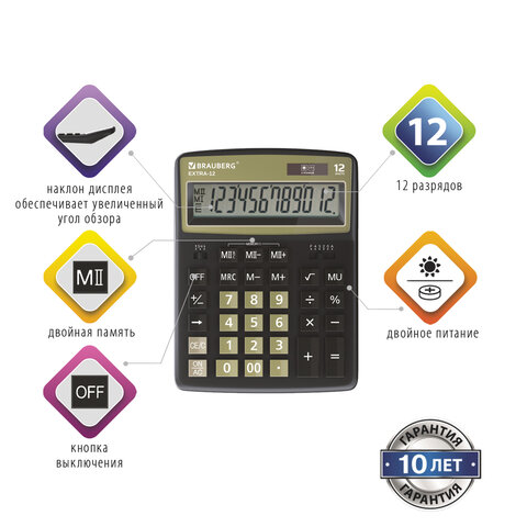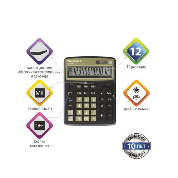 Настольный калькулятор BRAUBERG EXTRA-12-BKOL. Большой дисплей с увеличенным углом обзора, устойчивый корпус и клавиатура с цветной дифференциацией для эффективной работы с максимальным комфортом.