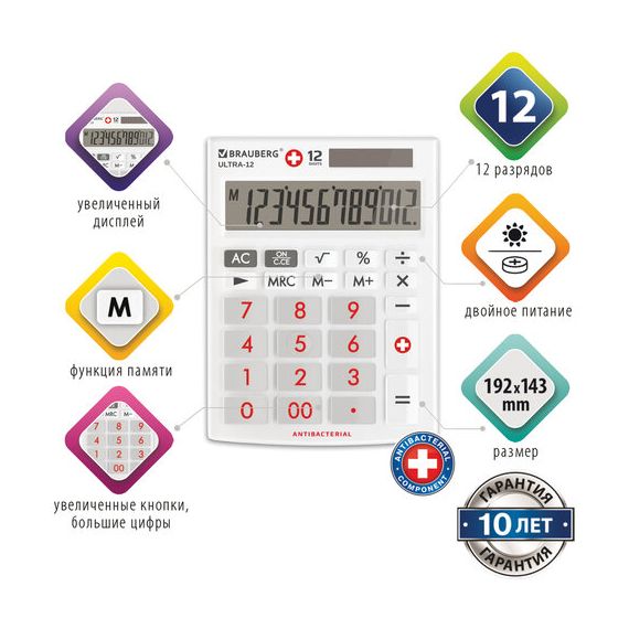 Калькулятор производит все основные арифметические действия: вычисление с памятью, вычисление с процентами, возведение в степень, извлечение квадратного корня, коррекция последнего введенного значения. Большой двенадцатиразрядный дисплей отображает результаты вычислений с высокой точностью округления. Наличие функции отображения последнего нажатого знака (сложения, вычитания, умножения или деления) позволит не запутаться при длительных монотонных действиях. Встроенный аккумулятор и солнечная батарея позволяют калькулятору работать при любом освещении, а функция автоматического отключения (через 8-10 минут бездействия) позволяет максимально продлить срок его службы без замены батареи. Антибактериальный компонент - смесь ионов серебра и цинка, содержащийся в пластике, препятствует распространению бактерий на поверхности калькулятора.