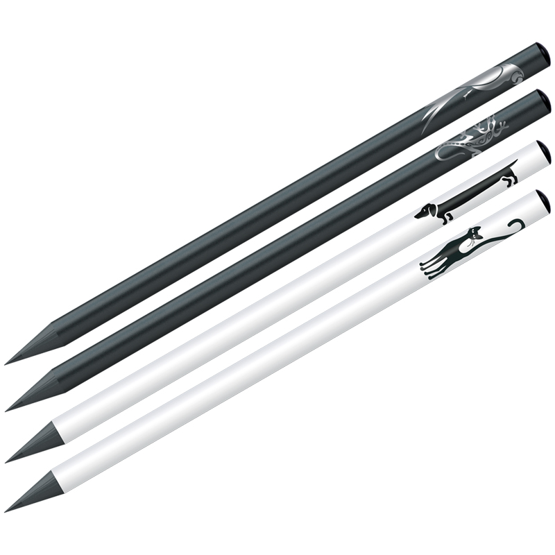 Чернографитный карандаш из черного дерева, с заточкой. Подходит для черчения и рисования. Диаметр грифеля 2,2мм, твердость HB, круглая форма, штрих-код на корпусе. Контрастная черно-белая печать на корпусе силуэтами животных, ассорти 4 дизайна. Упаковка в тубу по 72шт.