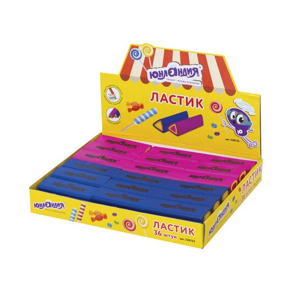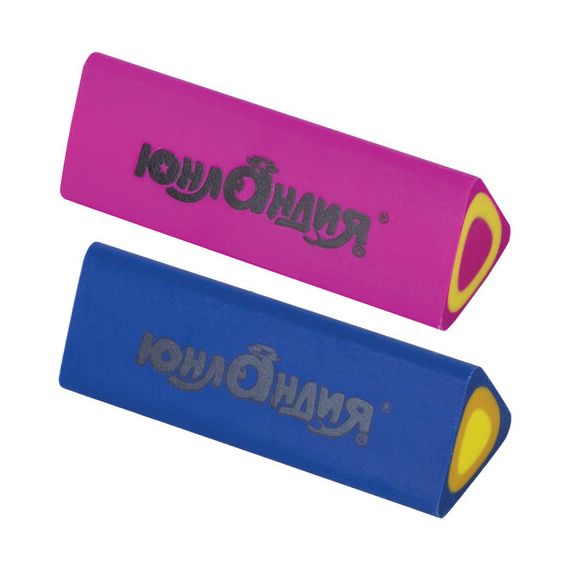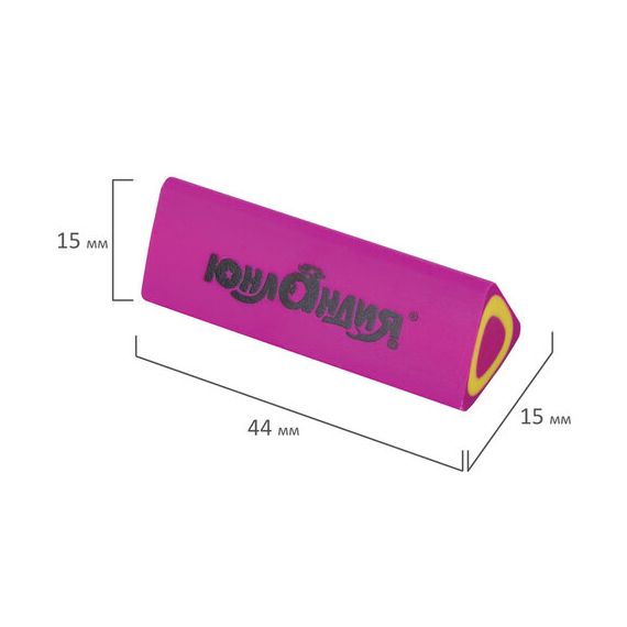 Имеет треугольную эргономичную форму и сочетает в себе микс нескольких цветов ассорти. Ластик обеспечит лёгкое и чистое стирание без повреждения поверхности бумаги и без образования бумажной пыли. Размер - 44х15х15 мм. Поставляется в картонном дисплее.