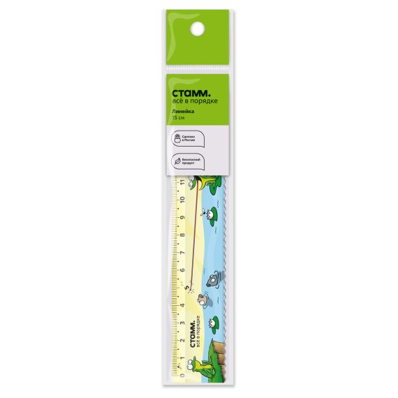 Линейка «СТАММ» предназначена для выполнения чертёжных и измерительных работ. Изделие имеет контрастную миллиметровую шкалу. Длина шкалы – 15 см, ширина линейки – 31 мм. Изделие имеет безопасные закруглённые края. Линейка оборудована волнистым краем для подчёркивания выделяемых слов и словосочетаний. Изготовлена из качественного полистирола, и имеет гладкую глянцевую поверхность. Упакована в пакет с европодвесом. Линейка выполнена в оригинальном и ярком дизайне.
