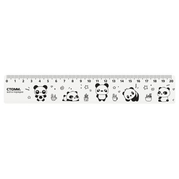 Линейка СТАММ "Панды" предназначена для чертёжно-измерительных работ. Длина шкалы – 20 см, ширина линейки – 35 мм. Изделие имеет безопасные закруглённые края и чёткую контрастную миллиметровую шкалу. Линейка изготовлена из качественного полистирола, и имеет гладкую глянцевую поверхность. Линейка дополнена оригинальным дизайном. Цвет изделия – прозрачный.