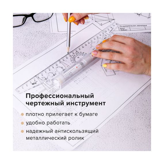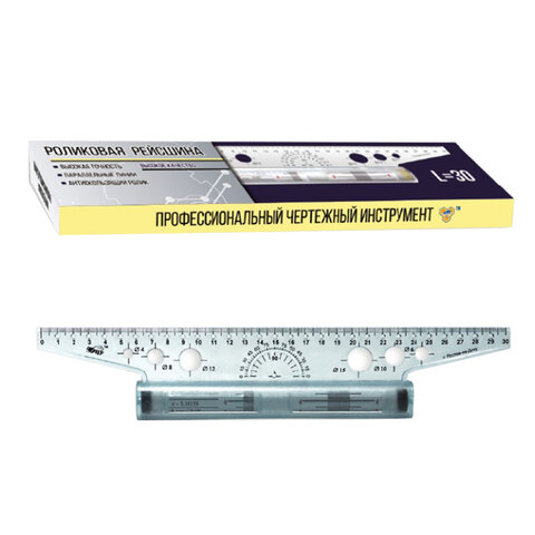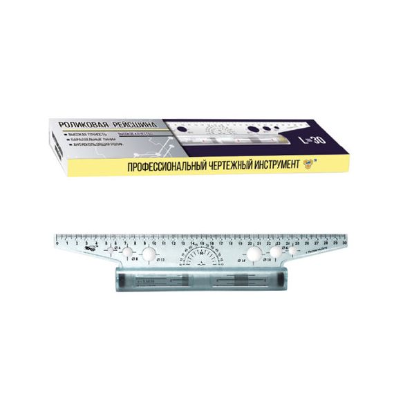 Профессиональный чертежный инструмент в виде линейки с металлическим роликом. Включает в себя транспортир, и отверстия. Позволяет проводить параллельные линии на определенном расстоянии друг от друга. На ролике нанесены часто используемые формулы.