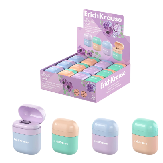 Точилка ERICH KRAUSE "Case Pastel Bloom" с контейнером, пластиковая, корпус ассорти
