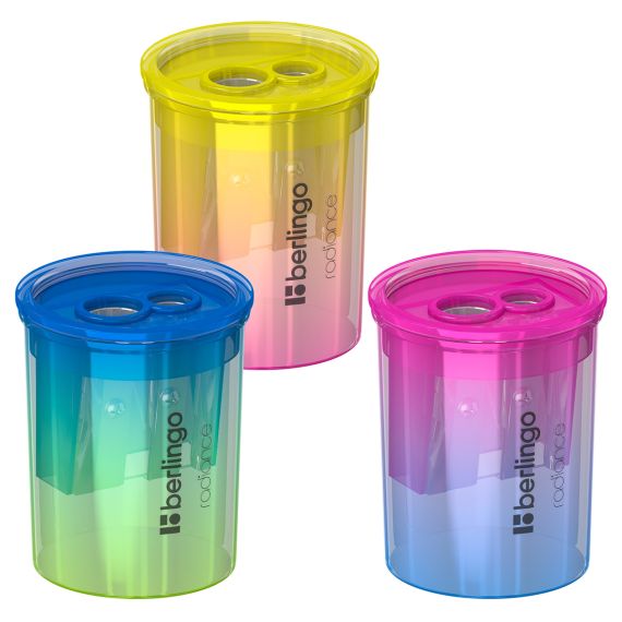 Точилка для карандашей пластиковая Berlingo "Radiance". 3 цвета ассорти в стиле градиент. С вместительным полупрозрачным пластиковым контейнером для сбора стружки. Лезвие из углеродистой стали, острое и устойчивое к повреждениям, сделано в Германии.