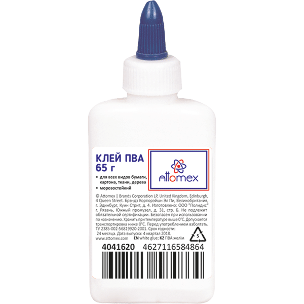Клей ПВА "Attomex" морозоустойчивый (5 циклов) 65 г в пластиковой бутылочке с дозатором и съемным колпачком евро