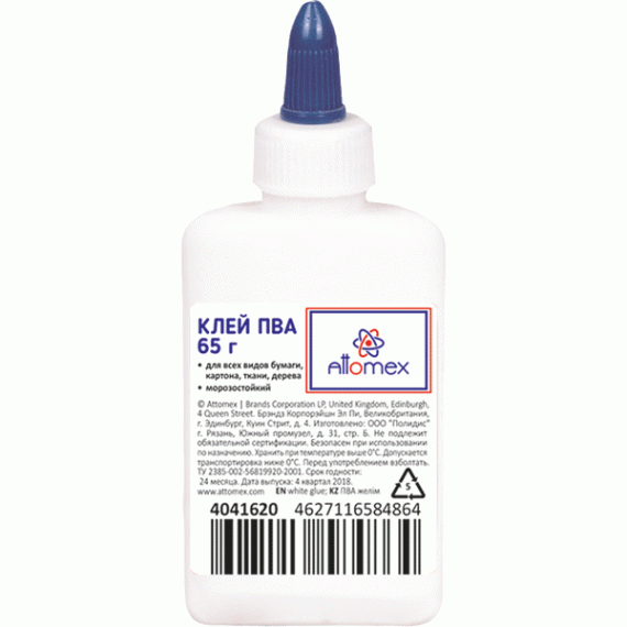 Клей ПВА "Attomex" морозоустойчивый (5 циклов) 65 г в пластиковой бутылочке с дозатором и съемным к