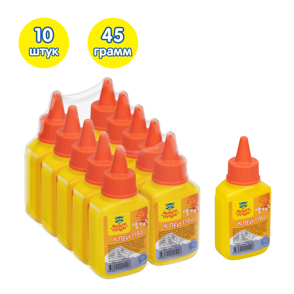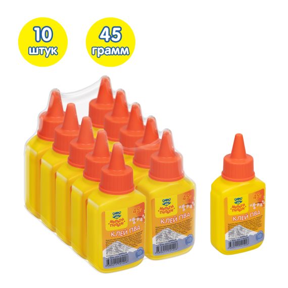 Клей ПВА "Мульти-Пульти" серии "Енот в Японии" является незаменимым помощником на уроках труда и занятиях творчеством! Вес - 45 граммов. В упаковке 10 штук. Предназначен для склеивания бумаги, картона, дерева, стекла, кожи, ткани. Клей морозостойкий. Выдерживает 5 циклов заморозки/разморозки при температуре до -40°С. Хранить при температуре выше +5°С. Удобная пластиковая упаковка с экономичным дозатором. Отлично подходит для создания поделок и работы на уроках труда. Для детей старше 3-х лет. Перед использованием клей нужно взболтать.