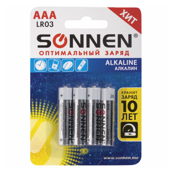 Алкалиновые батарейки SONNEN популярного типоразмера ААA идеально подходят для приборов со средним и высоким потреблением энергии. Рекомендуется использовать в фотоаппаратах, mp3-плеерах, компьютерных мышах и пультах ДУ.