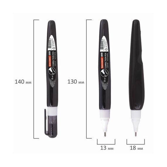 Быстросохнущий корректор на спиртовой основе имеет объем 8 мл и обладает устойчивостью к морозу. Надежный металлический наконечник обеспечивает экономичный расход корректирующей жидкости. Корректирующая ручка оснащена клапанным механизмом, и подача жидкости осуществляется с помощью нажатия на наконечник ручки. Перед началом использования ОБЯЗАТЕЛЬНО встряхните ручку. На корпус ручки не следует оказывать повышенное физическое давление, за исключением случаев, когда ручкой давно не пользовались.