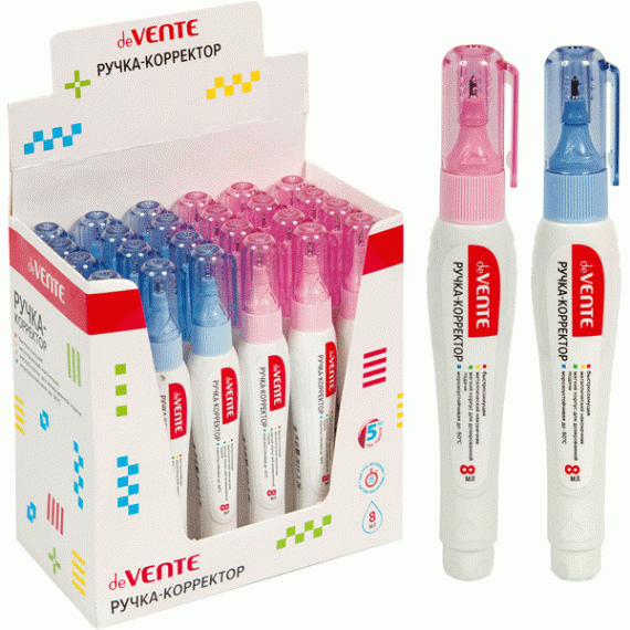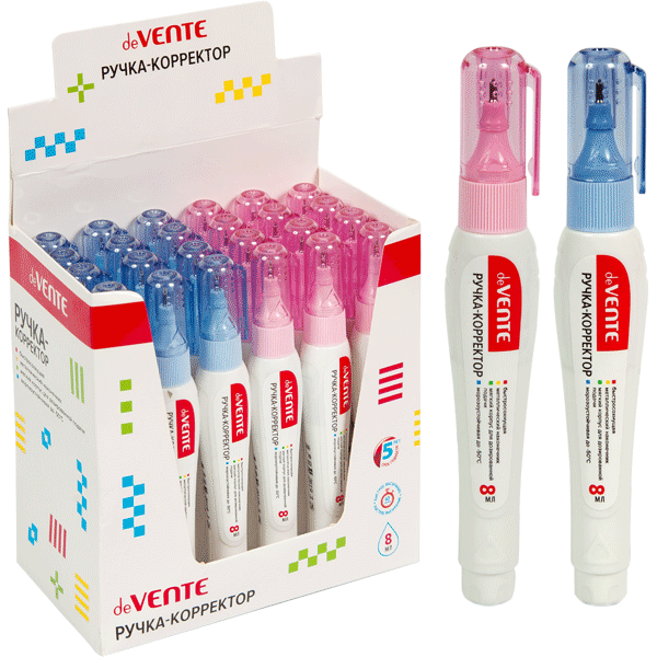 Ручка-корректор "deVENTE" 08 мл, быстросохнущая, трубчатая система подачи, в картонном дисплее с пластиковым поддоном