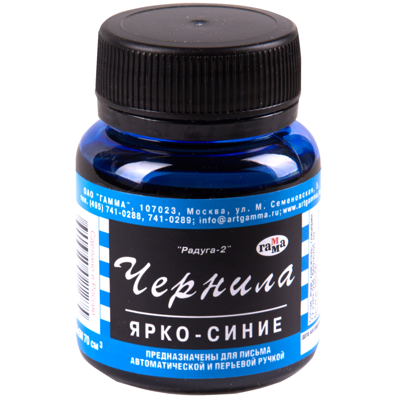 Чернила ГАММА «Радуга» для дозаправки перьевых и автоматических ручек на водной основе имеют оптимальную консистенцию, дают четкие линии, не растекаются во время письма, не проступают на обратную сторону бумаги. В составе только краситель, вода и глицерин. Время высыхания – 30 секунд. Товар выпускается в пластиковом флаконе с ярко-синим цветом чернил и объёме 70 мл.