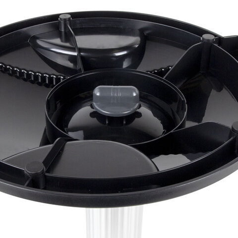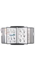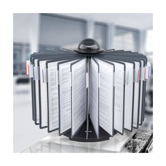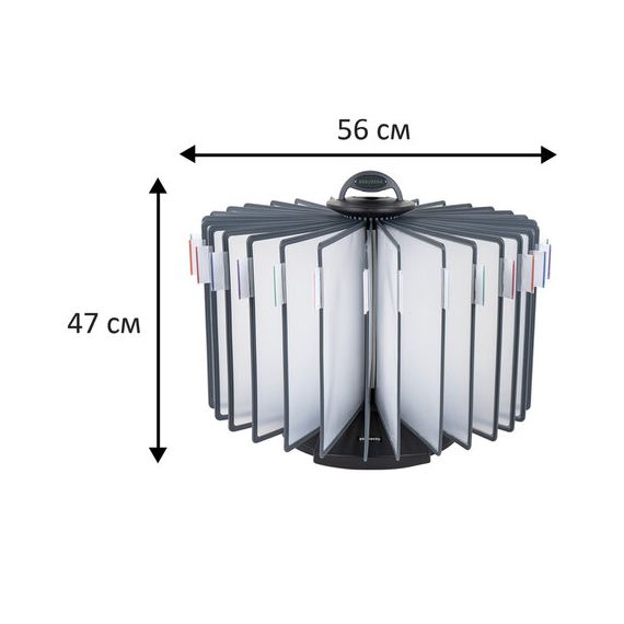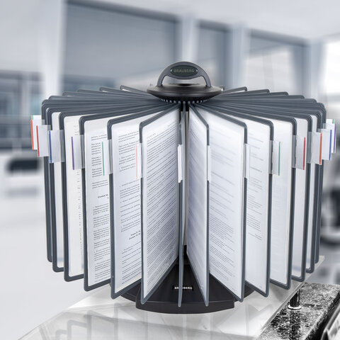 30 двухсторонних панелей серого цвета позволяют разместить одновременно до 60 листов формата А4. Прочные и гибкие литые рамки панелей изготовлены из полипропилена, пригодного для повторной переработки и дальнейшего использования. Демопанели оснащены съемными ярлычками-табуляторами для маркировки и удобного поиска нужной информации. Карман демопанели из прочного прозрачного материала с антибликовым покрытием надежно защитит документы от внешних воздействий. Устойчивое основание и поворот на 360 градусов гарантируют удобство пользователю и быстрый доступ к документу. Стильный черный цвет пластикового корпуса подойдёт для большинства современных интерьеров.