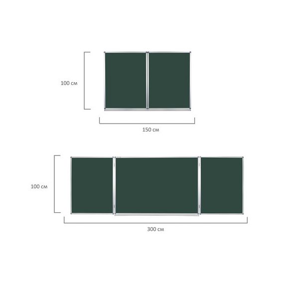 Рабочие поверхности доски предназначены для письма и рисования мелками, а металлическая поверхность позволяет размещать информацию при помощи магнитов. Состоит из 3-х элементов: центральная односторонняя секция – 100х150 см, двусторонние боковые секции – каждая по 100х75 см. Элементы крепления и полка для принадлежностей входят в комплект. Цвет: зеленый.