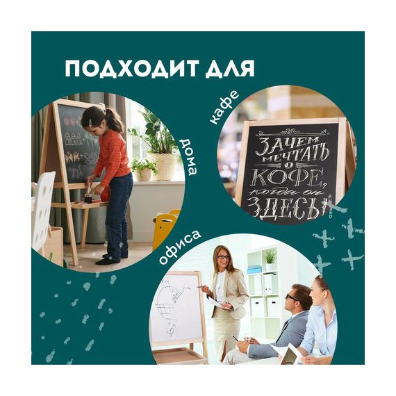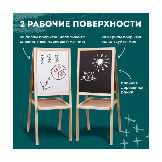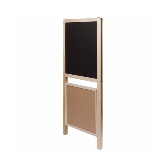 - двустронняя: первая рабочая белая поверхность для письма специальными маркерами, вторая рабочая чёрная поверхность для письма мелом;