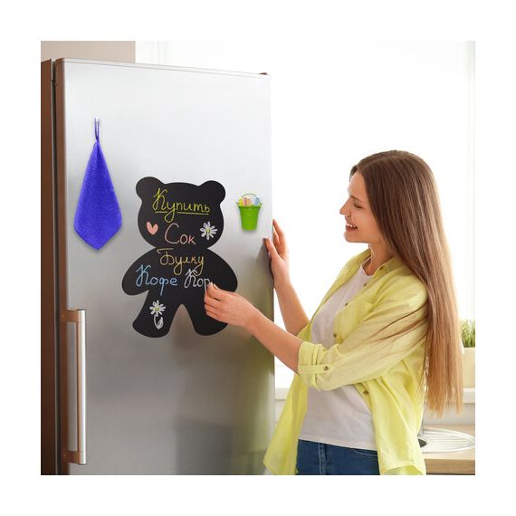 Меловая доска на холодильник в форме занимательного медвежонка предназначена для письма мягкими мелками и сухой пастелью. Это гибкая магнитная доска, которая легко крепится к гладким металлическим поверхностям и не требует дополнительной фиксации.