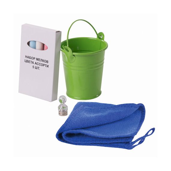 Комплект аксессуаров включает в себя: 5 мелков цвета ассорти, интересный металлический держатель для мела в форме ведерка, который вы также можете прикрепить к металлической поверхности с помощью двух неодимовых магнитиков в комплекте, салфетка из микрофибры (с «ушком» для подвешивания) и магнит специальной формы, удобной для подвешивания салфетки.