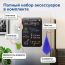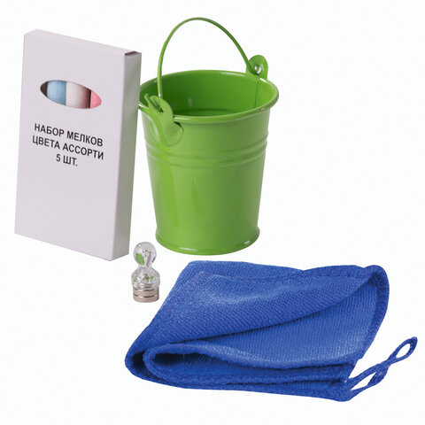Комплект аксессуаров включает в себя: 5 мелков цвета ассорти, интересный металлический держатель для мела в форме ведерка, который вы также можете прикрепить к металлической поверхности с помощью двух неодимовых магнитиков в комплекте, салфетка из микрофибры (с «ушком» для подвешивания) и магнит специальной формы, удобной для подвешивания салфетки.