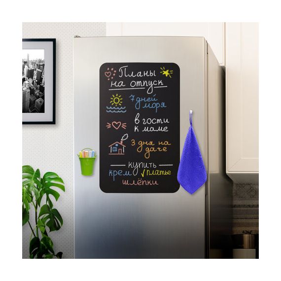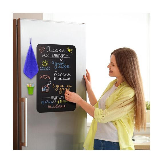 Доска на холодильник магнитно-меловая это идеальный инструмент для заметок, пожеланий или переписок со своими домочадцами, рисования или черчения графиков, ведения учёта калорий или продуктов, необходимых для покупки.