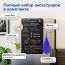 Комплект аксессуаров включает в себя: 5 мелков цвета ассорти, интересный металлический держатель для мела в форме ведерка, который вы также можете прикрепить к металлической поверхности с помощью двух неодимовых магнитиков в комплекте, салфетка из микрофибры (с «ушком» для подвешивания) и магнит специальной формы, удобной для подвешивания салфетки.