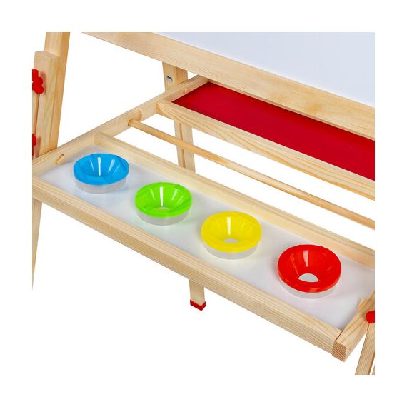 Поверхность мольберта белого цвета предназначена для рисования специальным маркером для белой доски, а также для размещения магнитов; черная поверхность – для рисования мелками.