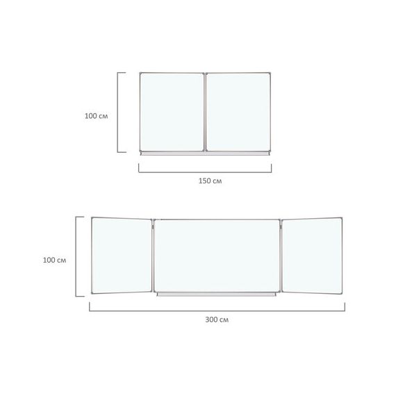Состоит из 3-х элементов: центральная односторонняя секция – 100х150 см, двусторонние боковые секции – каждая по 100х75 см. Элементы крепления и полка для принадлежностей входят в комплект.