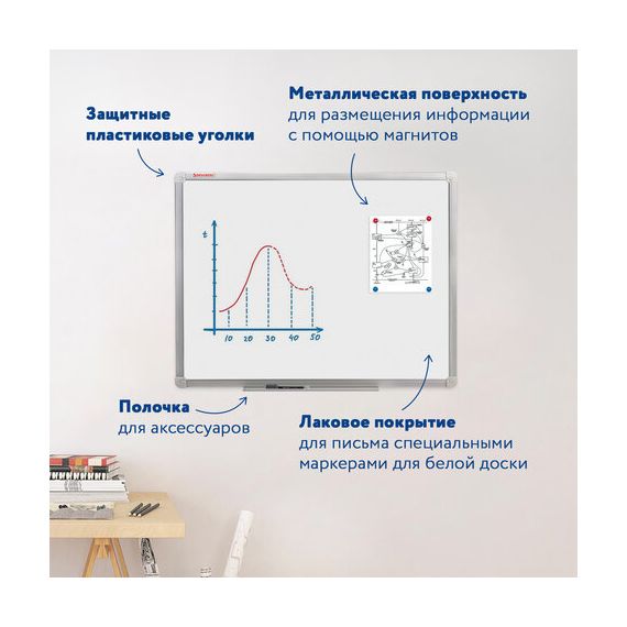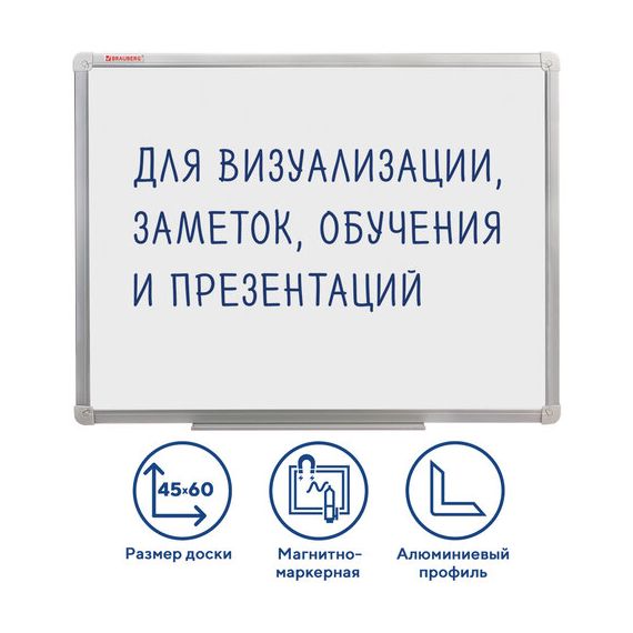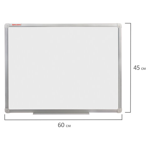 Лаковое покрытие предназначено для письма специальными маркерами для белой доски, а металлическая поверхность позволяет размещать информацию при помощи магнитов. Доска размером 45х60 см имеет укрепленные пластиковые уголки, которые позволяют скрыть места крепления к стене. Профиль придает изделию дополнительную прочность и современный стильный внешний вид. Полочка для аксессуаров и элементы крепления входят в комплект. Для защиты рабочей поверхности доски на нее нанесена защитная пленка. Перед началом работы – удалить защитную пленку. При должном уходе за рабочей поверхностью доски при помощи чистящей жидкости-спрея и стирателей BRAUBERG поверхность магнитно-маркерной доски прослужит более 10 лет.