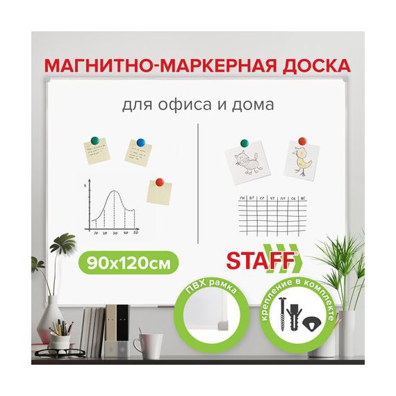 Доска магнитно-маркерная 90х120 см, ПВХ рамка, ГАРАНТИЯ 10 ЛЕТ, РОССИЯ, STAFF, 236159