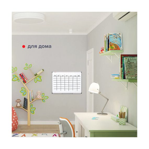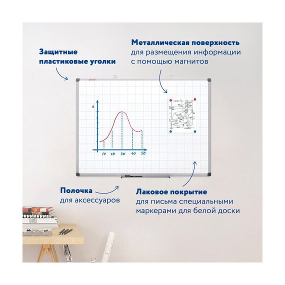 Лаковое покрытие предназначено для письма специальными маркерами для белой доски, а металлическая поверхность позволяет размещать информацию при помощи магнитов. Алюминиевая рама придает доске необходимую прочность. Элементы крепления и полка для принадлежностей входят в комплект. Размер - 60х90 см.