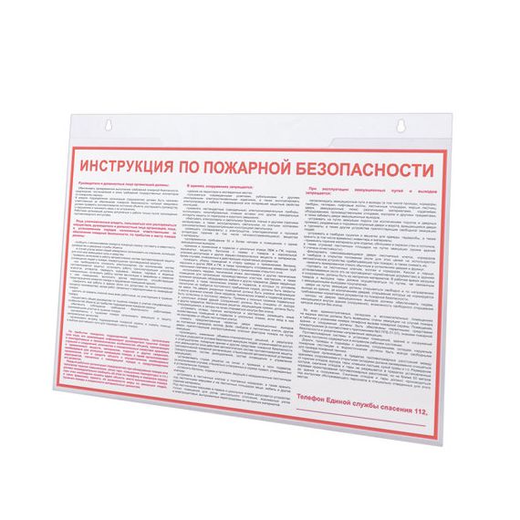 Изготовлена из прозрачного акрилового стекла. Крепление на стену производится через два верхних отверстия. Максимальная высота вставляемого листа - 210 мм, максимальная ширина вставляемого листа - 297 мм.