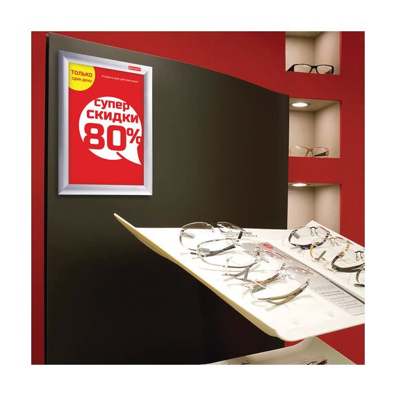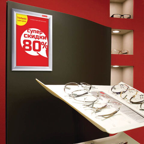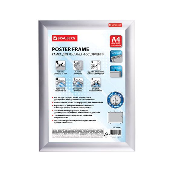 Рамка настенная для рекламы, А4 (210х297 мм), алюминиевый профиль, прижимные стороны, BRAUBERG, 232203