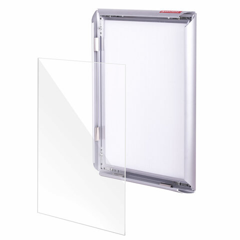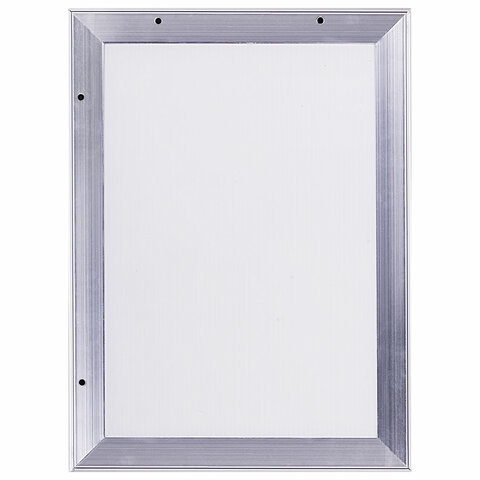 Профиль рамки изготовлен из анодированного алюминия. Изменяемое расположение – книжное или альбомное. Благодаря прозрачному антибликовому покрытию документы отчётливо видны посетителю, не мнутся и не загрязняются в течение всего эксплуатационного периода. Рамка крепится к стене через специальные отверстия при помощи дюбелей и саморезов. Элементы крепления входят в комплект. Максимальная высота вставляемого листа – 297 мм, максимальная ширина вставляемого листа – 210 мм. Цвет рамки - матовое серебро. Ширина багета – 2,5 см.