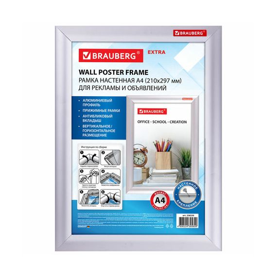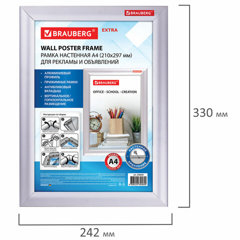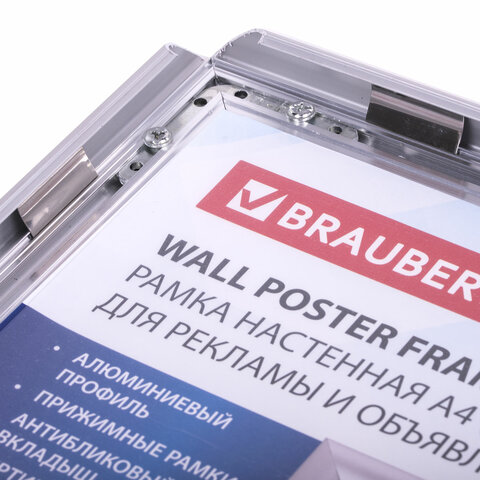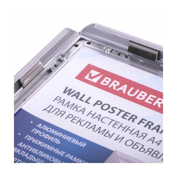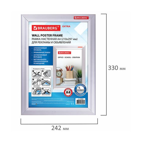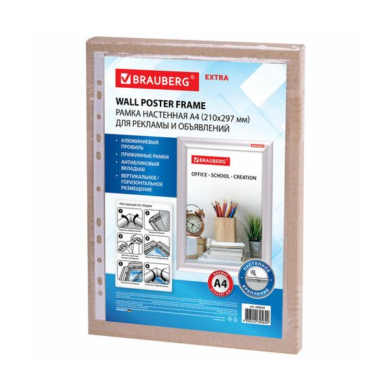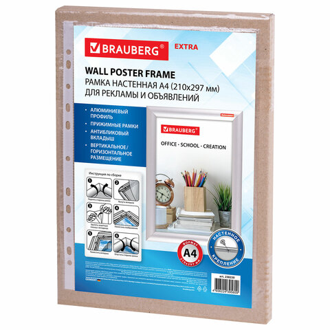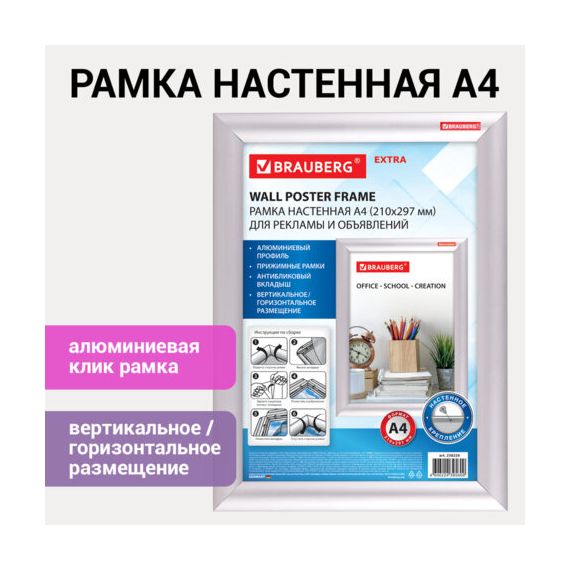 Рамка настенная с "клик"-профилем А4 (210х297 мм), алюминиевый профиль, BRAUBERG "Extra", 238220
