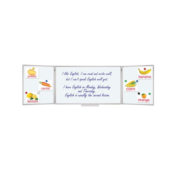 Лаковое покрытие предназначено для письма специальными маркерами для белой доски, а металлическая поверхность позволяет размещать информацию при помощи магнитов. Трехэлементная магнитно-маркерная доска имеет укрепленные пластиковые уголки, которые позволяют скрыть места крепления к стене. Центральная односторонняя секция – 100х150 см, двусторонние боковые секции – 100х75 см каждая. Алюминиевый профиль придает изделию дополнительную прочность и современный стильный внешний вид. Полочка для аксессуаров и элементы крепления входят в комплект. При должном уходе за рабочей поверхностью доски при помощи чистящей жидкости-спрея и стирателей BRAUBERG поверхность магнитно-маркерной доски прослужит более 10 лет.