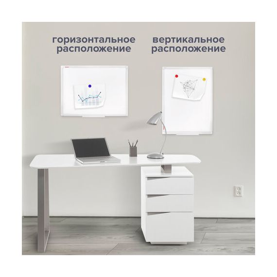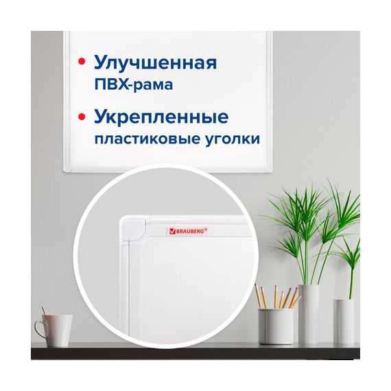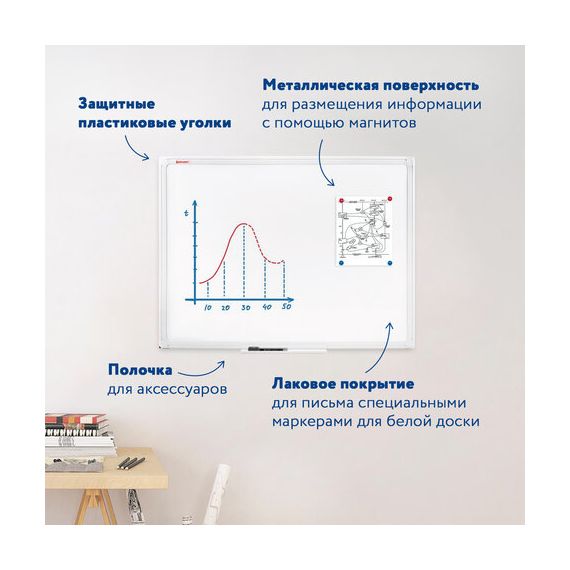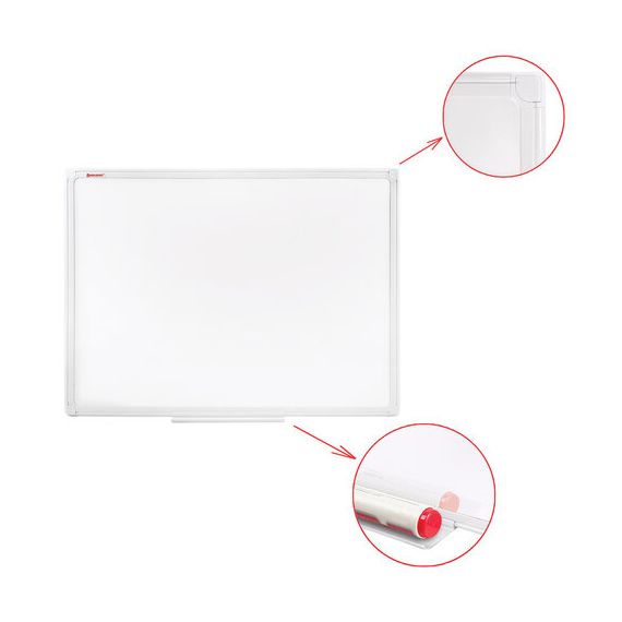 Лаковое покрытие предназначено для письма специальными маркерами для белой доски, а металлическая поверхность позволяет размещать информацию при помощи магнитов. Доска имеет укрепленные пластиковые уголки, которые позволяют скрыть места крепления к стене. Размер - 45х60 см. Пластиковый профиль придает изделию дополнительную прочность и современный стильный внешний вид. Полочка для аксессуаров и элементы крепления входят в комплект. Возможность горизонтального и вертикального крепления. Надежная упаковка: термоусадочная пленка и коробка. Перед началом работы – удалить защитную пленку. При должном уходе за рабочей поверхностью доски при помощи чистящей жидкости-спрея и стирателей BRAUBERG поверхность магнитно-маркерной доски прослужит более 10 лет.