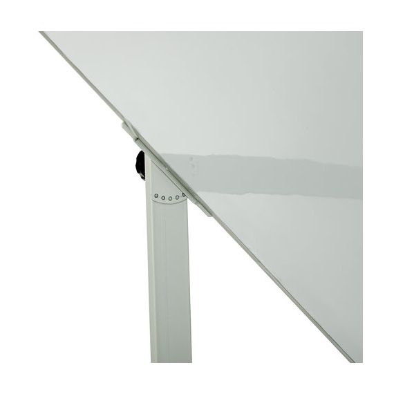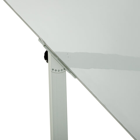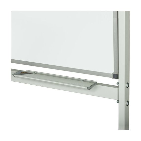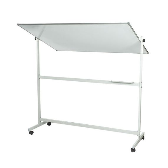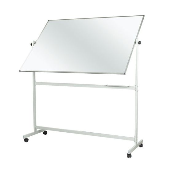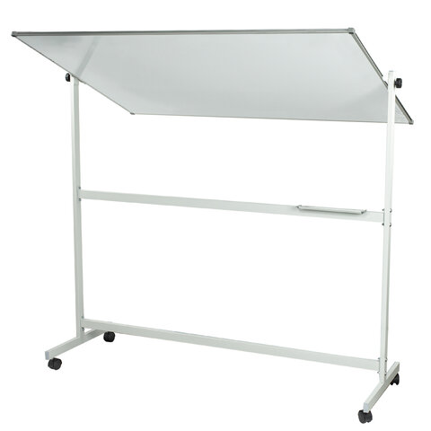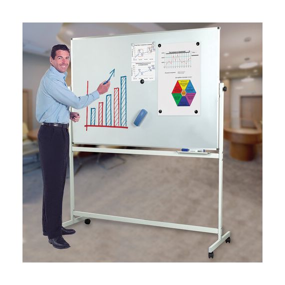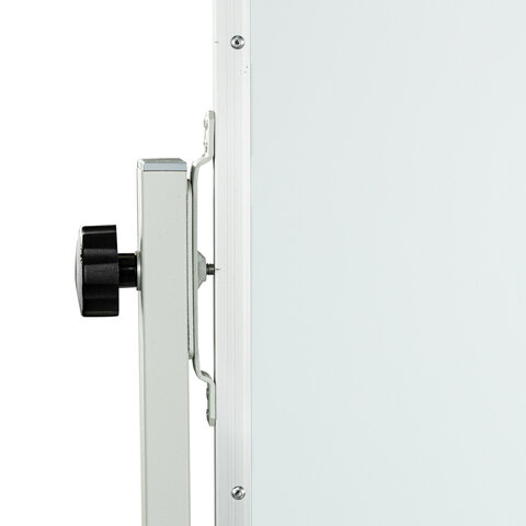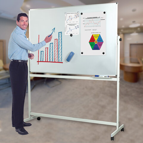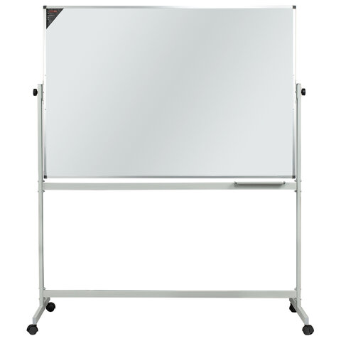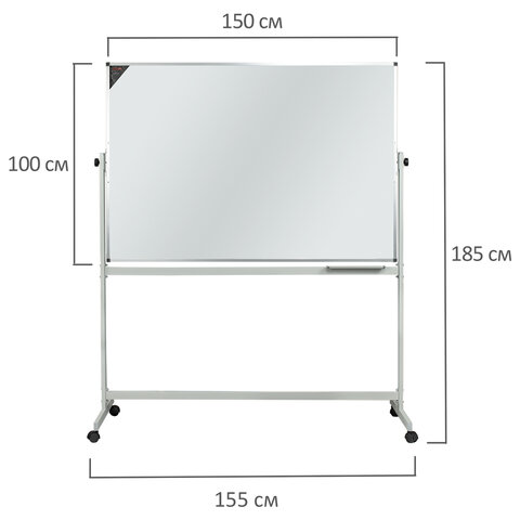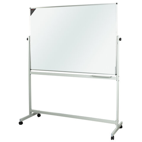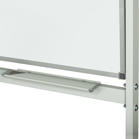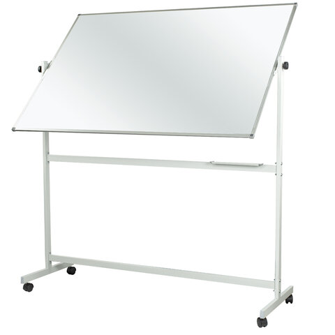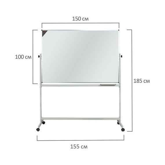 Лаковое покрытие предназначено для письма специальными маркерами для белой доски, а металлическая поверхность позволяет размещать информацию при помощи магнитов. Алюминиевая рама придает доске необходимую прочность. Две рабочие магнитно-маркерные поверхности расположены на стенде. Имеется возможность изменения радиуса наклона доски и фиксации полотна в одном из пяти положений. Перемещается на колесиках. Элементы крепления входят в комплект. Размер – 100х150 см. Размеры полки для маркера: длина – 40 см, ширина – 4,5 см. При должном уходе за рабочей поверхностью доски при помощи чистящей жидкости-спрея и стирателей BRAUBERG поверхность магнитно-маркерной доски прослужит более 10 лет.