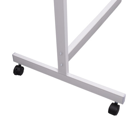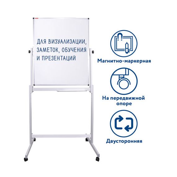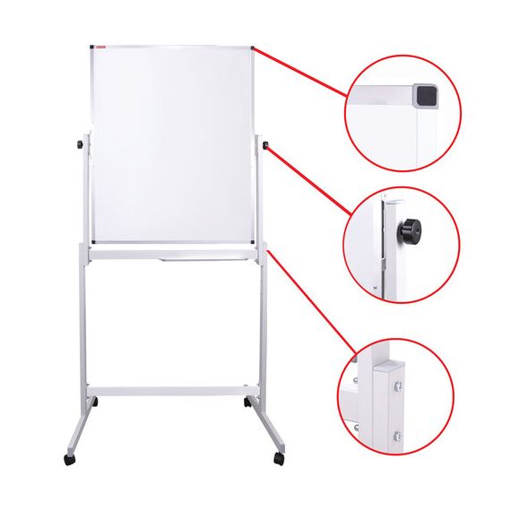 Лаковое покрытие предназначено для письма специальными маркерами для белой доски, а металлическая поверхность позволяет размещать информацию при помощи магнитов. Вращается в горизонтальной плоскости на 360°. Перемещается на колесиках. Алюминиевая рама придает доске необходимую прочность. Подставка для канцелярских принадлежностей позволяет всегда держать под рукой магниты, маркеры, стиратели и другие необходимые предметы. Элементы крепления входят в комплект. Защитная пленка предупреждает появление царапин, потертостей и сколов на рабочей поверхности доски при транспортировке и хранении продукции (перед началом работы необходимо удалить защитную плёнку). Размер: 60х90 см.