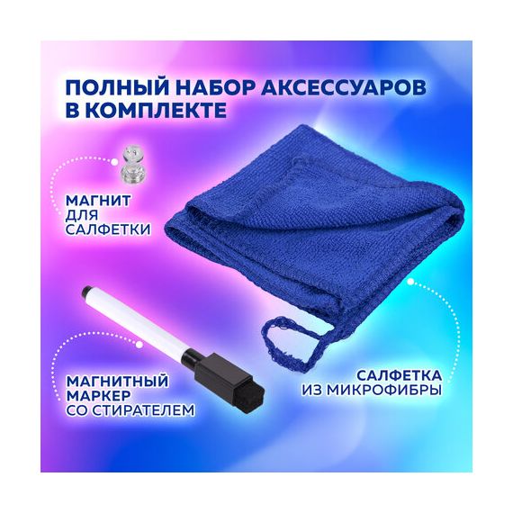 В комплекте: черный маркер для белых досок с магнитом и стирателем в колпачке, салфетка из микрофибры (с "ушком" для подвешивания) и магнит специальной формы, удобной для подвешивания тряпочки. Во избежание преждевременного высыхания маркер рекомендуется хранить на холодильнике, колпачком вниз.